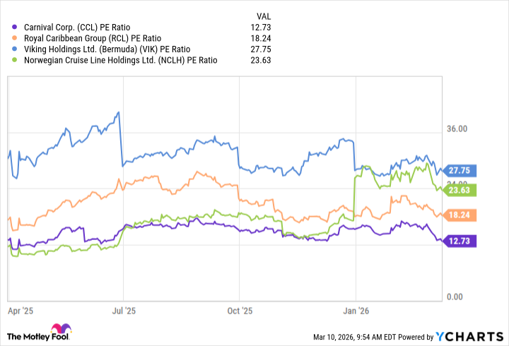 Большинство круизных акций не стоят слишком дорого, даже при высокой загрузке. Все, кроме Viking Holdings , торгуются по соотношению цены к прибыли (P/E) ниже среднего по S&P 500 , которое равно 29. Забавно.